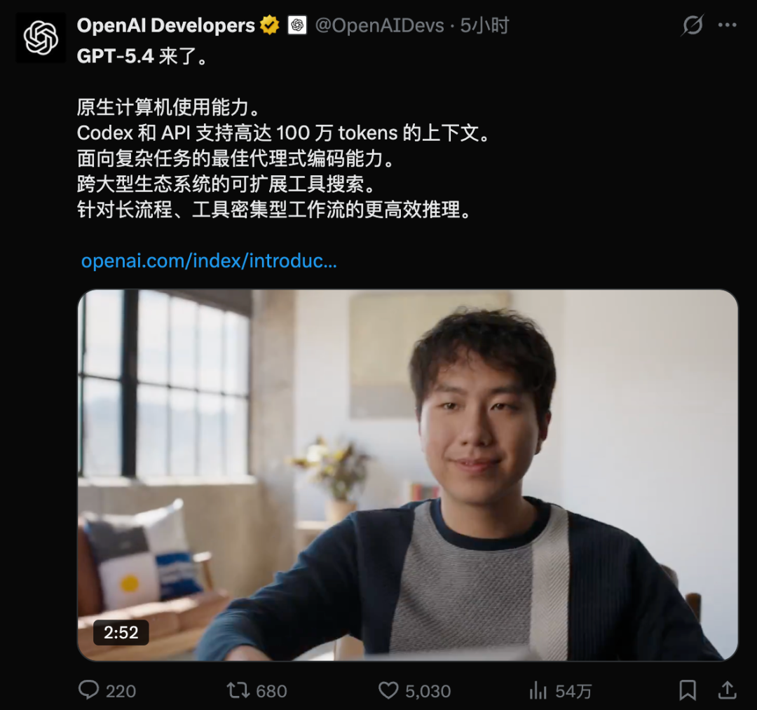 OpenClaw之父Peter评价GPT-5.4在编程才智提高不小外,在其他才智方面愈加斡旋、愈加智能。