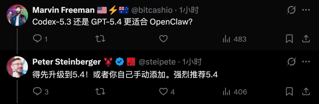OpenClaw的首创东说念主Peter保举将OpenClaw的版块升级到5.4之后,再结合GPT-5.4。