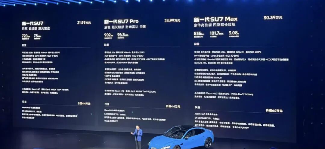 这需要和竞品对比。发布会上,雷军将新SU7与部分竞品(Model 3高性能版、智界S7 Max、极氪001高配版)作念了比较。从纸面数据看,SU7 Pro版的续航,以及Pro/Max版标配的双腔空悬+CDC,照竟然同价位变成了“水桶”上风。尤其是在面对Model 3的纯视觉有策画时,SU7试图用堆料硬件错位竞争。