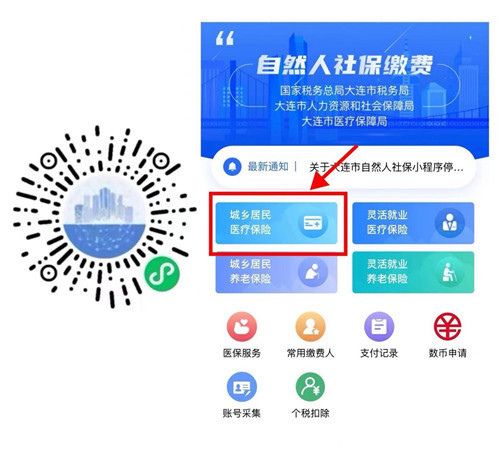 线上办理途径:扫描二维码,干预“大连市当然东说念主社保缴费”小要领,在“城乡住户医疗保障”模块中进行线上缴费。